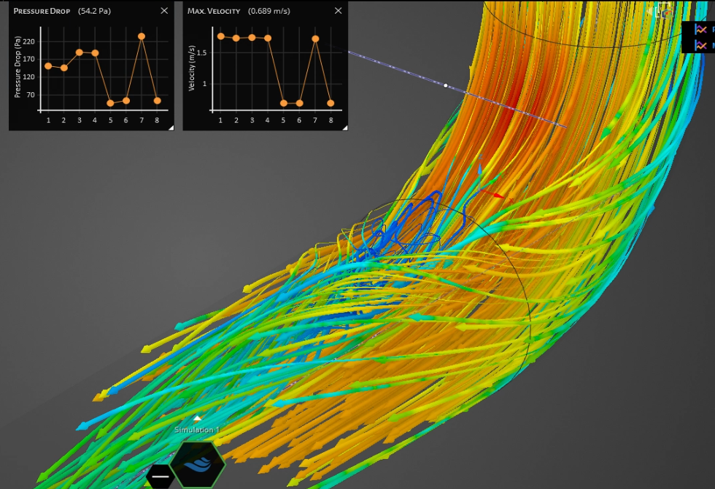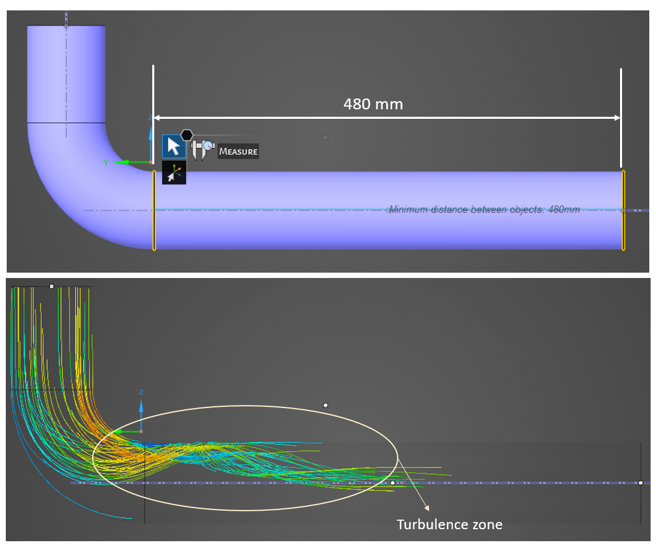Within this simulation, we quantified the necessary length of pipe essential for achieving a consistent and stable fluid pattern subsequent to its passage through an elbow.
