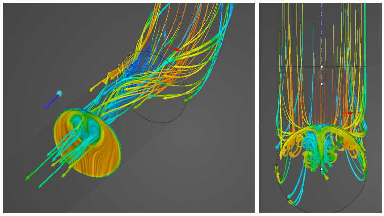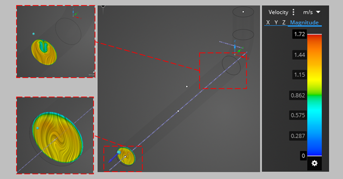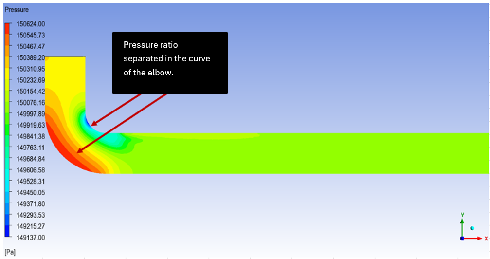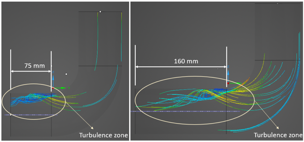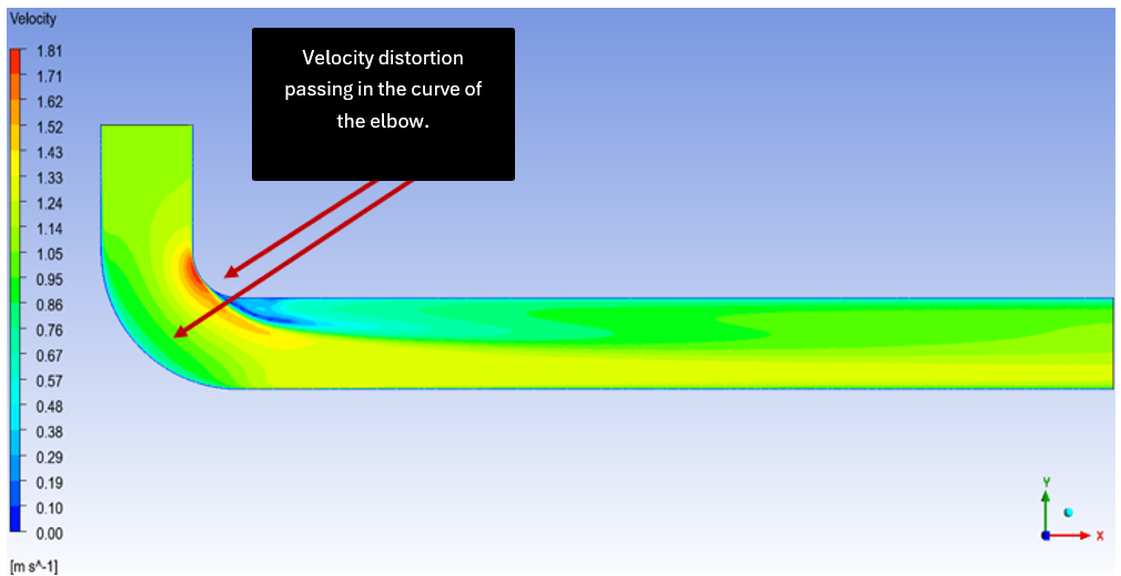 - Flow pattern entering the elbow: Linear, no turbulences.
